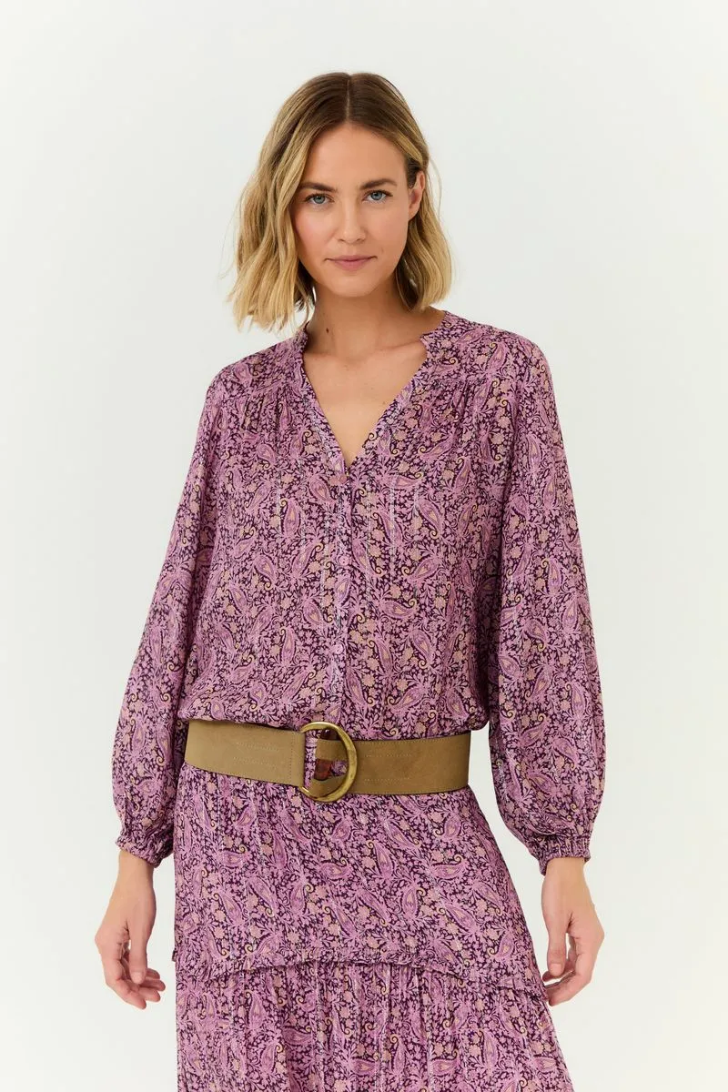 A Bata Estampa Aysha A traz uma interpretação leve e feminina da padronagem que inspira a coleção, combinando o visual delicado do desenho com o caimento fluido característico do GGT. A peça valoriza a silhueta com seu decote em V suave, pregas discretas que criam um movimento contínuo e mangas amplas que reforçam a sensação de leveza. É uma proposta versátil, que transita com facilidade entre produções casuais e arrumadas, mantendo sempre um toque de frescor.