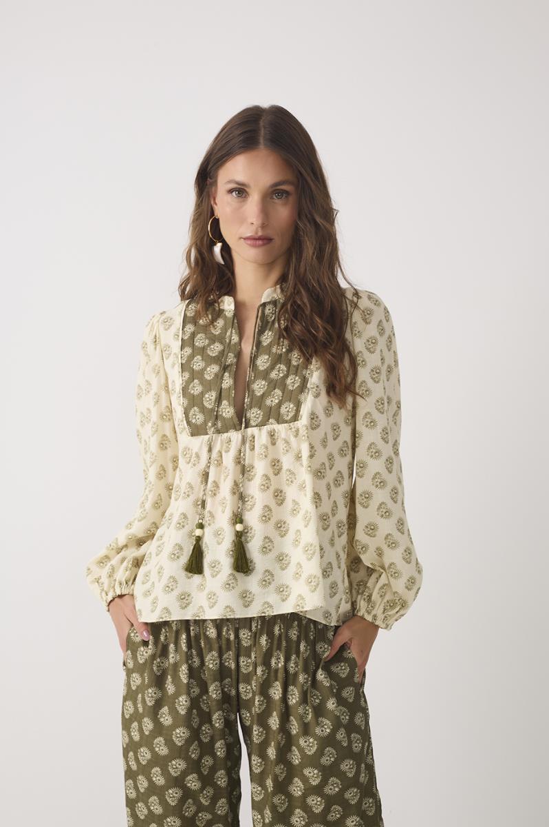 O shape soltinho e despojado que amamos. A bata estampa miragem mix possui comprimento alongado, decote em v com amarração e mangas longas bufantes com punhos ajustados.