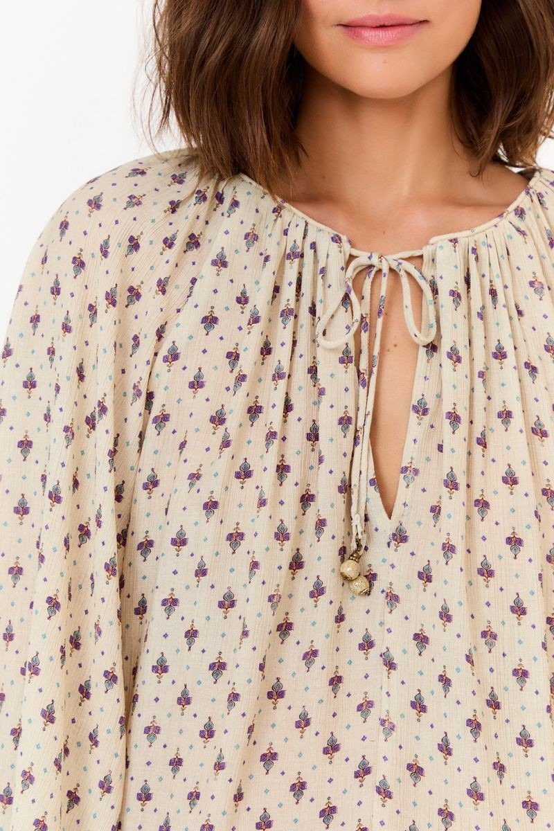A Blusa Bata Estampa Zaz feita em viscose com toque de poliamida, tem caimento fluido e textura sutil, que se movem com o corpo com naturalidade. O decote V ajustável com cordinhas e ponteiras em metal traduz o espírito easy chic da temporada — uma mistura entre o artesanal e o sofisticado. A estampa delicada de mini flores reforça a feminilidade contemporânea e atemporal da peça.