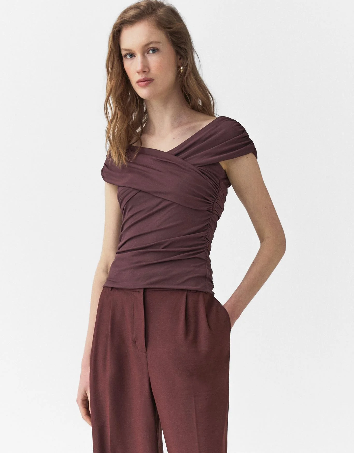 Blusa malha de comprimento médio, manga curta, modelagem fit, Decote ombro a ombro; Drapeados laterais,;Peça forrada.