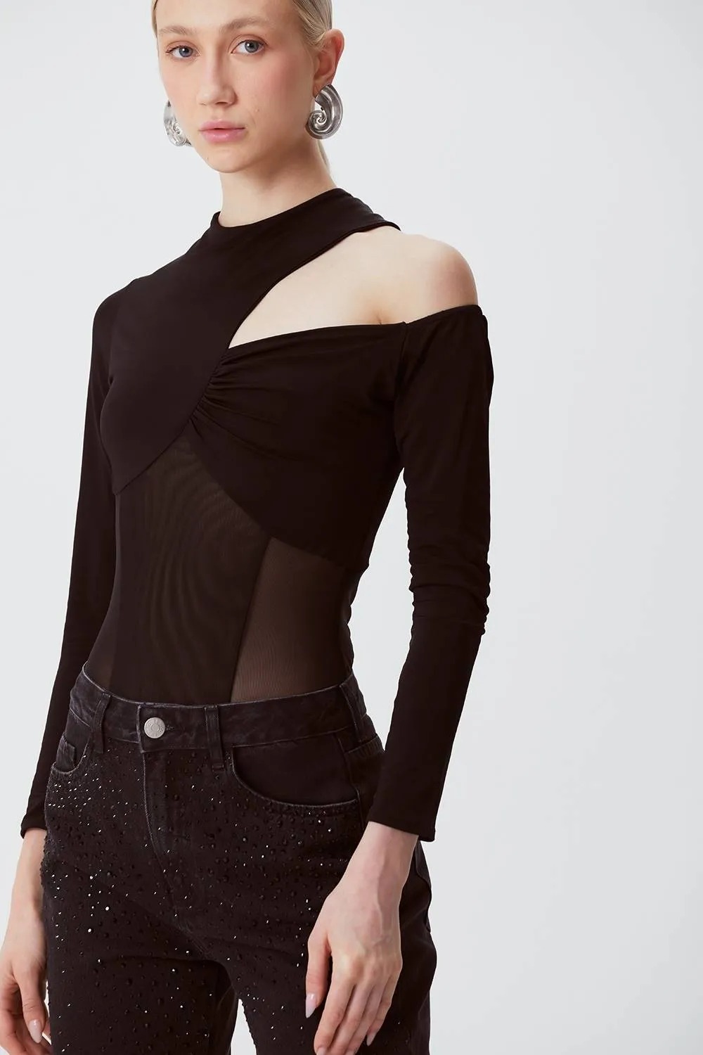 O Body Heloísa é confeccionado em jersey premium, possui transparência, decote assimétrico, mangas longas e uma leve transparencia.