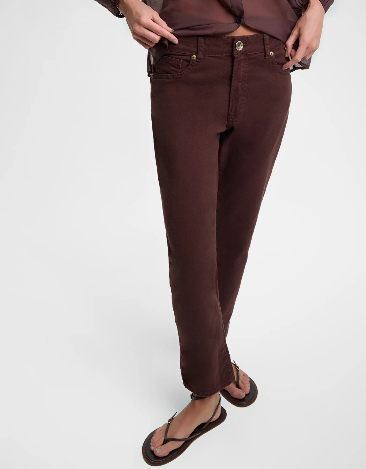 Calça jeans com comprimento longuete, cintura média, modelagem slim, fechamento frontal por braguilha com zíper e botão de metal no cós, peça five pockets, barra convencional