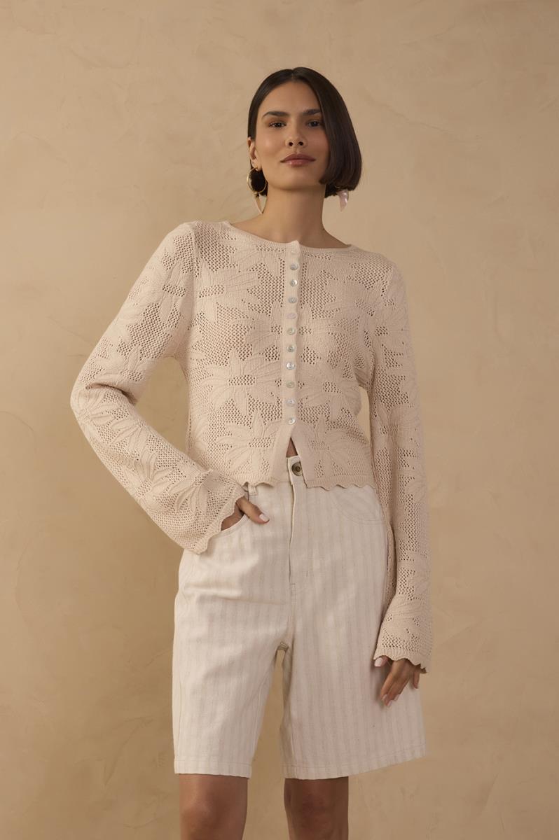 O Casaqueto Névoa Floral é aquela peça apaixonante que une delicadeza e conforto. Confeccionado em tricot de alta qualidade com trama em jacquard, ele apresenta desenhos florais em relevo que criam uma textura única e elegante. Com um caimento levemente cropped e acabamento em ondas na barra e punhos, ele é o complemento ideal para os dias de brisa leve.