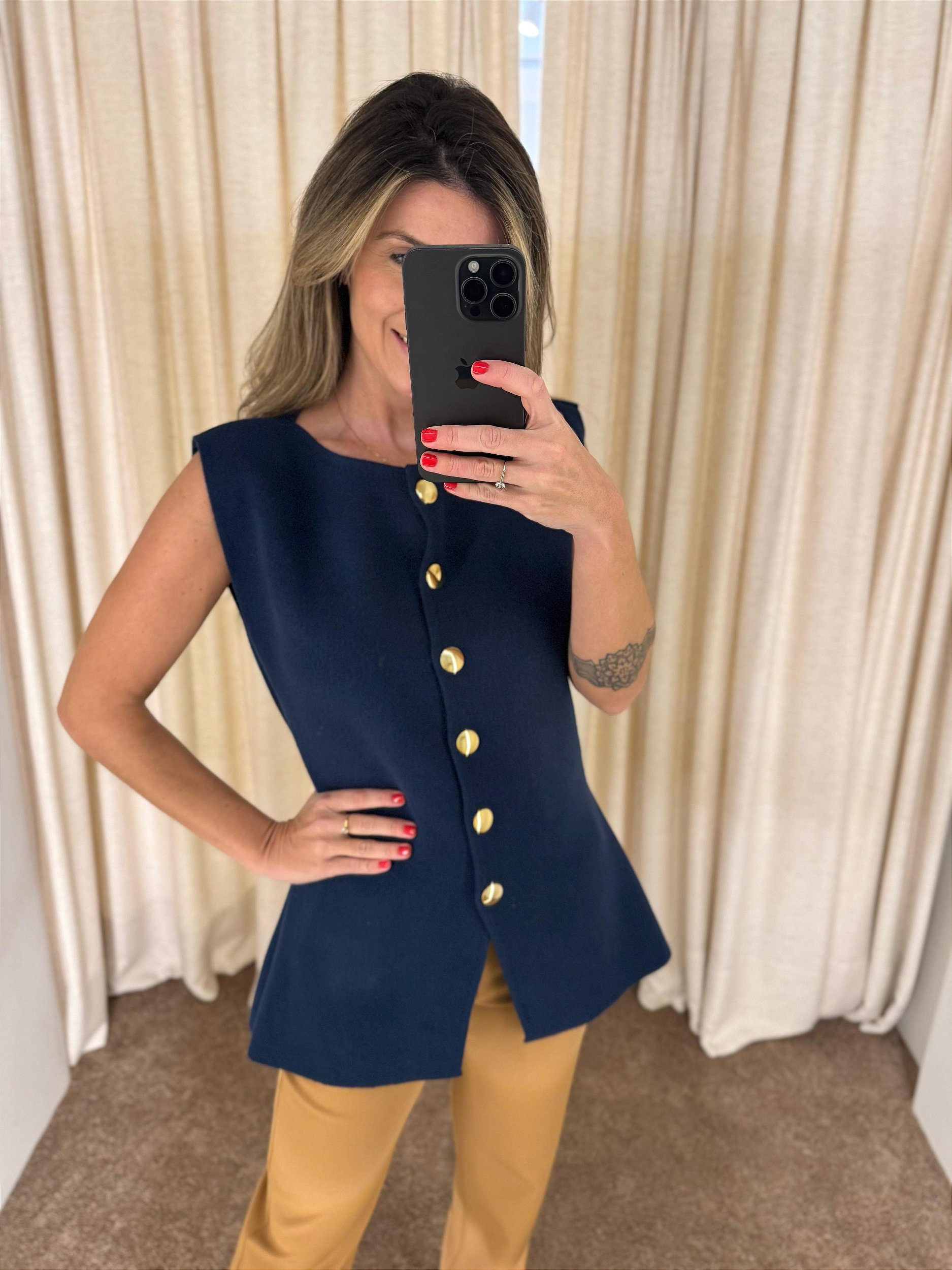 Colete alongado em tricot com fechamento por botões dourados. Modelagem que alonga e valoriza a silhueta. Aposte!