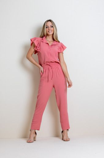 Conjunto em crepe, blusa de botões com babados nas laterais. Calça com elástico na cintura.