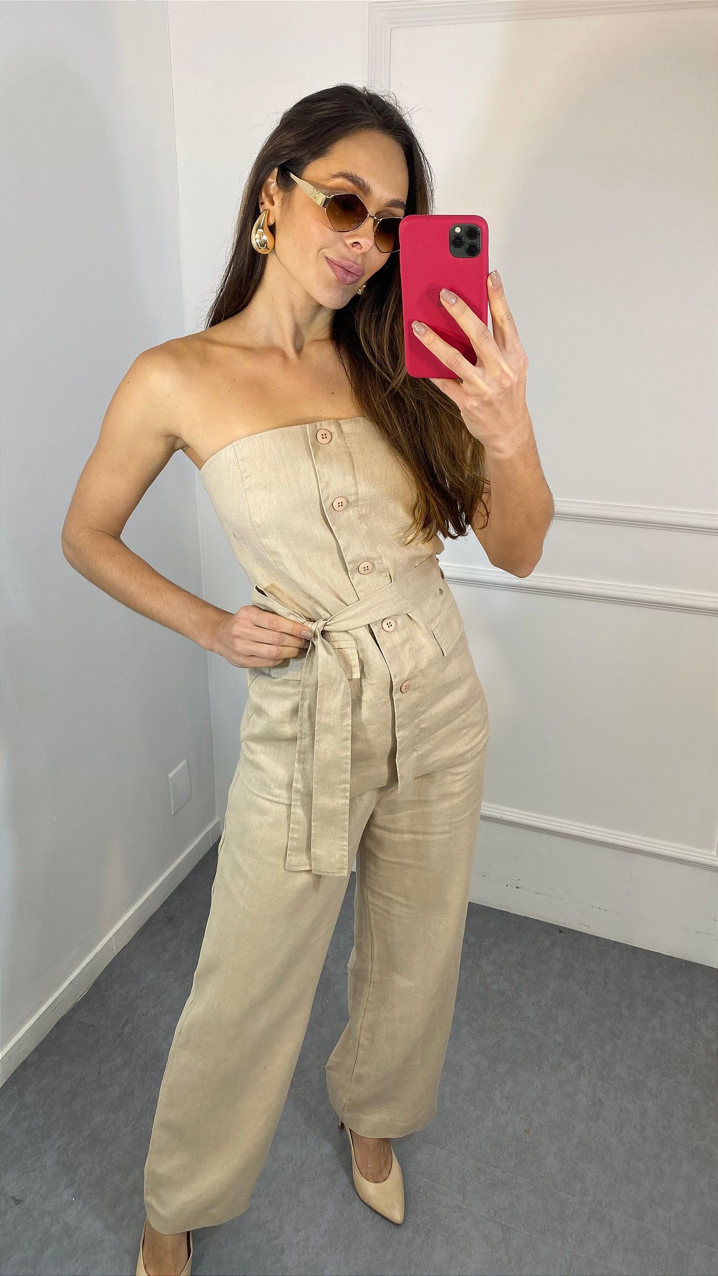 Conjunto em linho com calça wide leg e tomara que caia com cinto.