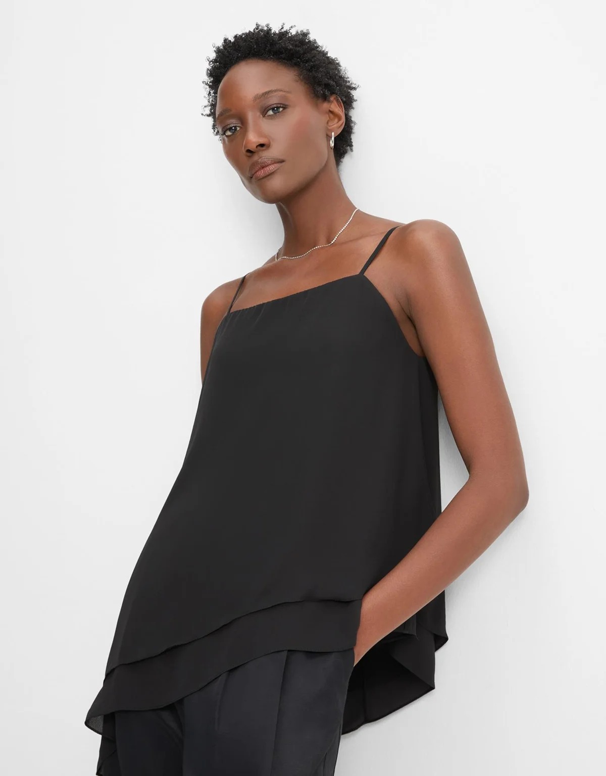 Regata longa, Alças finas e reguláveis, modelagem ampla, decote reto, barra assimétrica;
