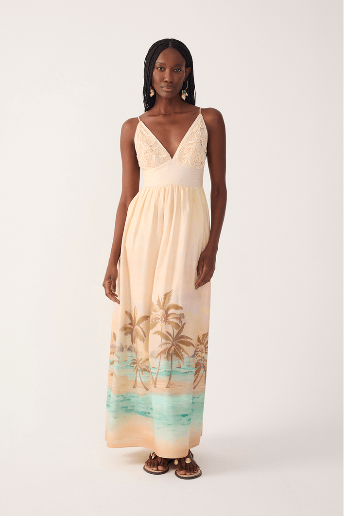 Este vestido longo é a escolha ideal para quem busca um visual fluido com um toque artesanal. O busto em renda trabalhada e o decote em V valorizam o colo de forma delicada, enquanto as alças finas trazem a frescura necessária para os dias de sol.