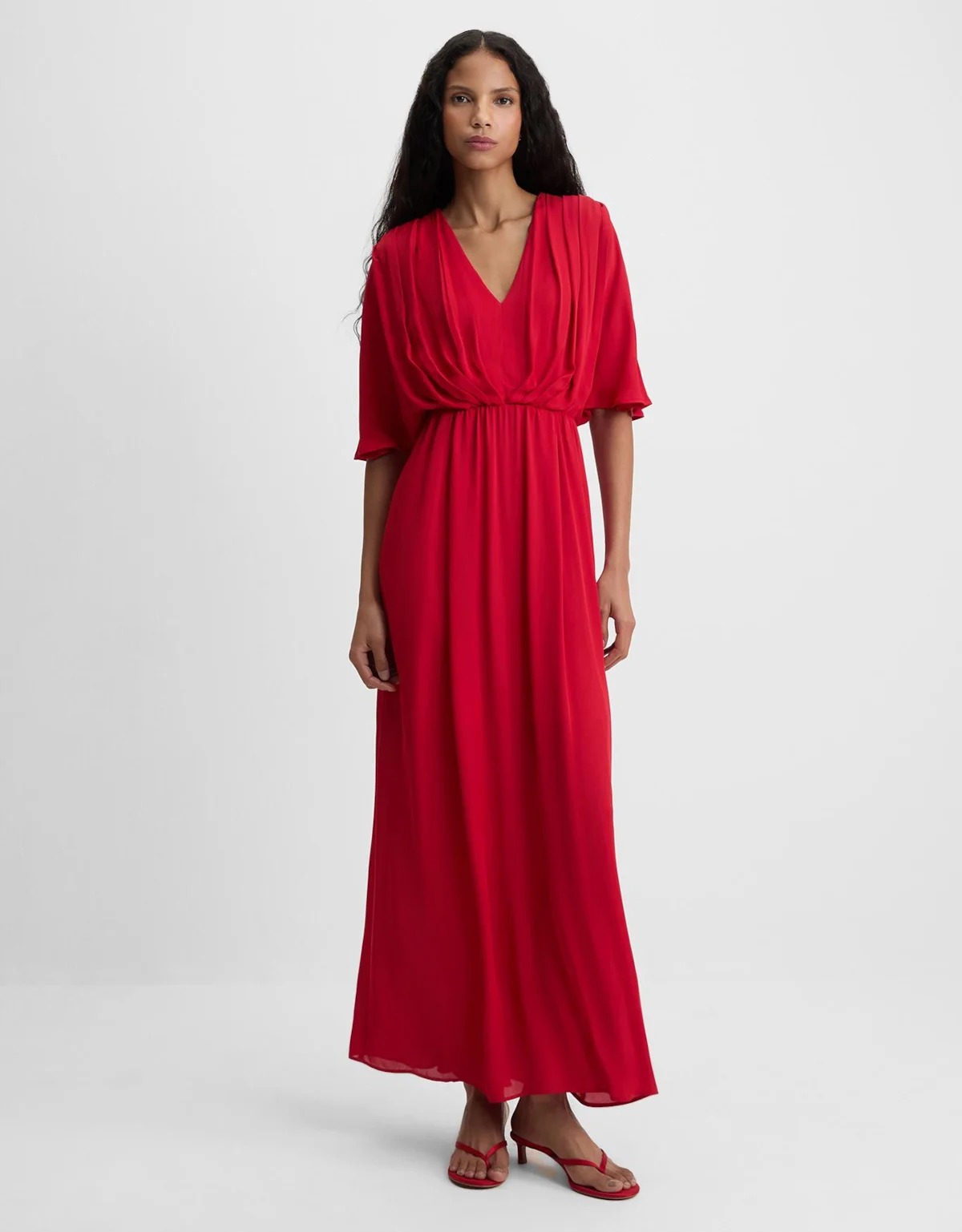 Vestido midi; Manga curta; Modelagem evasê; Decote v; Elástico na cintura para conforto; Pregas frontais na blusa; Saia forrada.